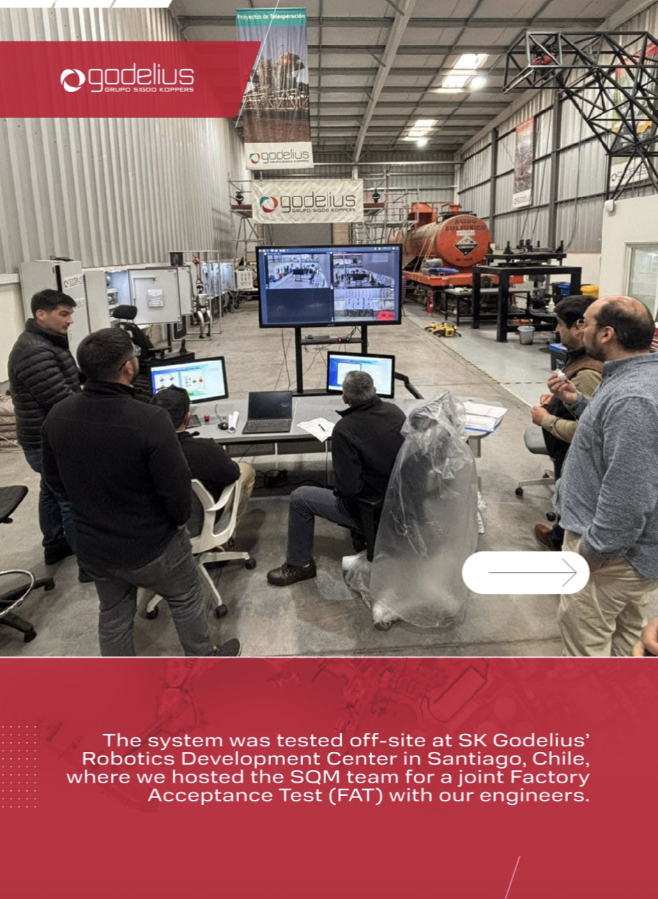 En nuestro Centro de Desarrollo Robótico en Santiago, SK Godelius completó con éxito la Prueba de Aceptación en Fábrica (FAT) de una de nuestras últimas soluciones de teleoperación: el control remoto de una grúa en el puerto de Tocopilla de SQM.